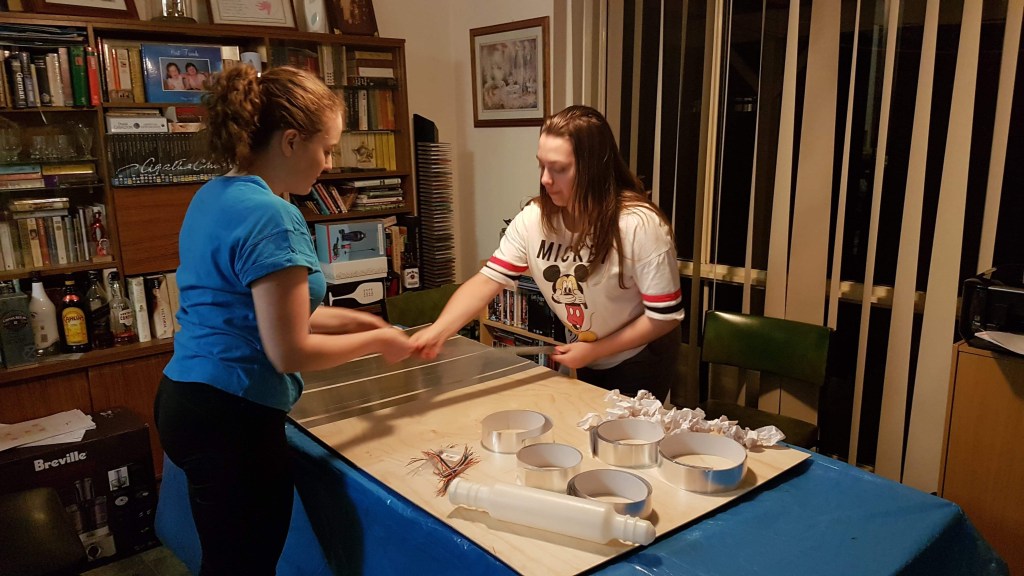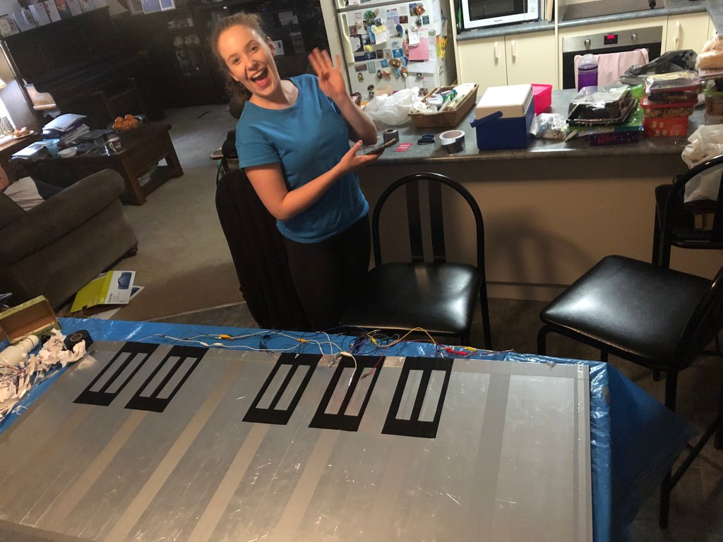 Jess and I got together one lovely Monday (after she had been on Prac – you go girl!) to create our large scale floor piano. We were so fortunate that Jess’ dad was willing to go to stores such as Bunnings Warehouse and Jaycar to get the supplies we needed! We spent the whole afternoon and evening assembling our piano – gluing foam mats to the bottom of the wood, measuring out where our keys were going to go, making sure the aluminium tape actually worked, etc. We had so much fun creating it, and were so proud when we were finally done! We both felt like Tech wizards when it all came together and worked. Go us!
